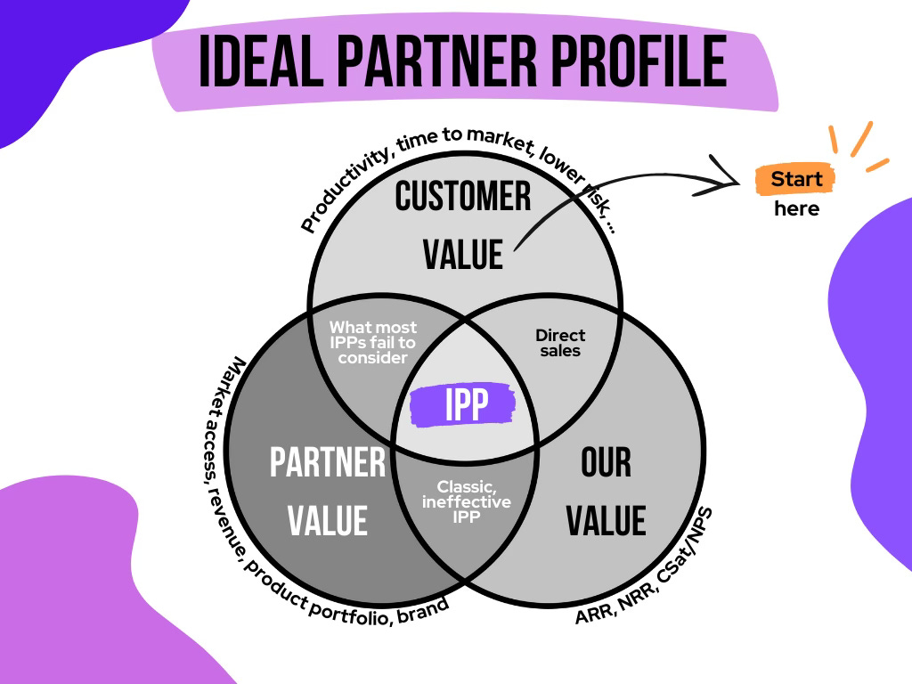 Most partner leaders approach an IPP similarly to an Ideal Customer Profile, where they look at partner capacity, pain points, etc. No, it’s not the same. We need to be clear: what are we selling to a partner? Revenue, plain and simple. Who pays? The customer. The challenge in creating an IPP is to not only consider the partner. The stars must align: the customer, the partner, and our business. What unifies the three? Value.